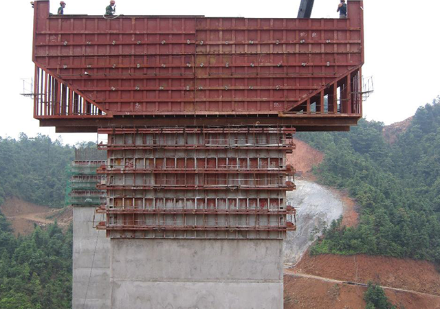 蓋梁模板采用托架法現澆,模板采用大塊組合鋼模,利用預留的孔洞安裝托架縱橫梁,在橫梁上拼裝好底模。然后先綁扎蓋梁鋼筋,經監理工程師檢查合格,再拼裝兩側的模板。